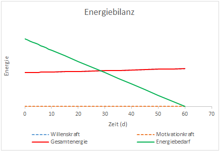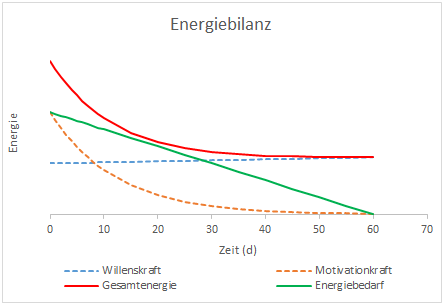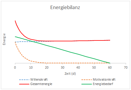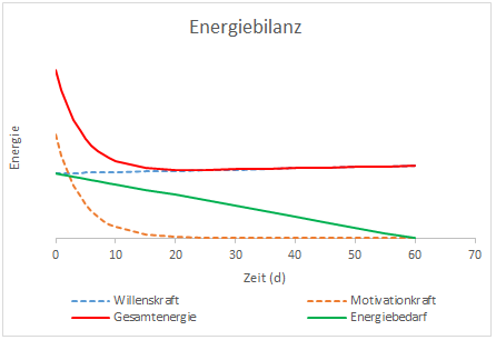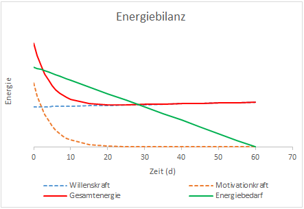 Wollen wir eine Gewohnheit dauerhaft aufbauen, müssen wir je nach Komplexität der Handlung täglich eine gewisse Energiemenge zu deren Umsetzung aufbringen (grün). Diese Energiemenge reduziert sich im Laufe der Zeit, da uns diese Handlung mit zunehmender Wiederholung zur Routine wird. Dem Gegenüber steht unsere zur Verfügung stehende Energie, die grundsätzlich durch unsere Willenskraft definiert ist. Die Willensstärke lässt sich ähnlich wie ein Muskel trainieren, wodurch bei der roten Linie ein leichter Anstieg zu verzeichnen ist. Will man eine Handlung nachhaltig umsetzen ist es entscheidend, dass sich die erforderliche Energielinie (grün) zu jedem Zeitpunkt unterhalb der Gesamtenergie (rot) bewegt. Im vorliegenden Fall kann man beobachten, dass diese Bedingung bereits zu Beginn des Vorhabens nicht erfüllt wird. Das bedeutet dass der Veränderungsprozess nicht in Gang kommen kann und das Vorhaben schon zu Beginn scheitert.